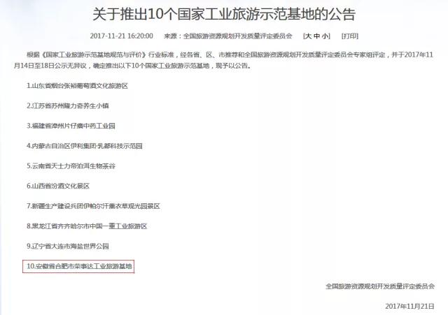 - 11月21日,全國旅游資源規(guī)劃開發(fā)質(zhì)量評定委員會發(fā)布公告,公布10個國家工業(yè)旅游示范基地,安徽省合肥市榮事達(dá)工業(yè)旅游基地成為安徽省唯一入選單位。