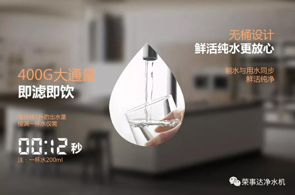 為提升用戶的“時效”體驗,榮事達400G智能反滲透凈水機從一開始產(chǎn)品定位就是400加侖出水速度,具體是什么概念呢?200ml一杯水,12秒就可以接滿,創(chuàng)新定制的400G大通量濾芯出水速度約為常規(guī)50G凈水機的8倍,隨時飲水無需等待,為生活留下更多時間欣賞窗外美景。