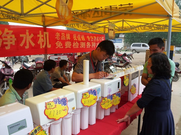 - 5月26日,榮事達(dá)在河南信陽甘岸鎮(zhèn)開展“榮事達(dá)凈水機(jī) 入小區(qū) 下基層 送健康”活動,推廣健康飲水。榮事達(dá)凈水產(chǎn)品深受當(dāng)?shù)叵M(fèi)者喜愛,活動當(dāng)天售出30多臺機(jī)器。活動期間,榮事達(dá)在甘岸鎮(zhèn)免費(fèi)檢測水質(zhì),借助TDS測試筆、水質(zhì)電解器等科學(xué)檢測儀器,居民可以了解水質(zhì)凈化前后的顯著區(qū)別。工作人員在現(xiàn)場準(zhǔn)備了做凈水實驗的演示機(jī)器,居民可以觀看整個凈水過程。通過凈水演示及產(chǎn)品講解,居民對榮事達(dá)純水機(jī)、管線機(jī)、凈水器等產(chǎn)品有了一定了解,對產(chǎn)品使用功能產(chǎn)生了濃厚的興趣。在此次活動中,榮事達(dá)還專門推出了免費(fèi)試用凈水機(jī)的服務(wù),讓當(dāng)?shù)鼐用裣润w驗產(chǎn)品,使用滿意后再購買,以便當(dāng)?shù)叵M(fèi)者買得放心、用得順心。此外,顧客在活動當(dāng)天購買凈水機(jī)還可獲贈精美禮品。此次活動受到當(dāng)?shù)鼐用褚恢潞迷u,市場反響好評如潮。通過這樣的凈水普及活動,當(dāng)?shù)鼐用駥Π踩嬎?、健康生活有了新的認(rèn)識。