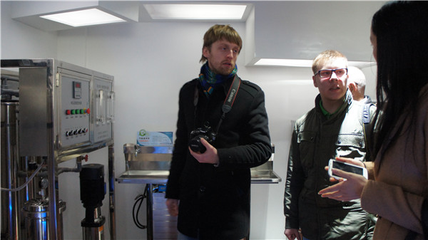 在榮事達(dá)家電研發(fā)中心二樓展廳,色彩紛呈、形態(tài)各異的凈水產(chǎn)品引得許多乘客注目凝視。出于對(duì)自動(dòng)售水機(jī)的好奇,考察團(tuán)許多成員一進(jìn)門便被吸引過去,通過介紹,他們紛紛夸這個(gè)大家伙方便好用??吹骄缕恋摹懊贰⑻m、竹、菊”純水機(jī)時(shí),兩名俄羅斯女士不禁用英語單詞“nice”表達(dá)了自己的喜愛之情。