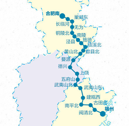 合福高鐵是京福高鐵的重要組成部分,全長806公里,是國內(nèi)第四條設(shè)計(jì)時(shí)速350公里的雙線電氣化高速鐵路。作為溝通華中與華南地區(qū)的一條大能力客運(yùn),途經(jīng)安徽、江西和福建三省,由于其線路貫穿武夷山、三清山、婺源、黃山多個(gè)著名旅游景區(qū)而被稱為國內(nèi)顏值最高的最美高鐵。