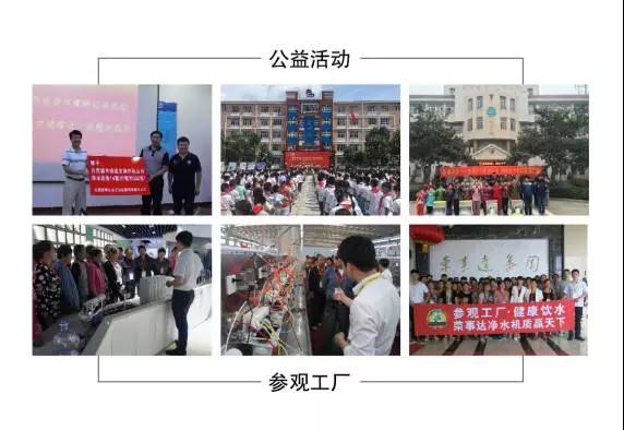 榮事達(dá)針對(duì)消費(fèi)者對(duì)凈水機(jī)了解不足的問(wèn)題,長(zhǎng)期推出“參觀(guān)工廠(chǎng)”活動(dòng),讓消費(fèi)者全面見(jiàn)證產(chǎn)品生產(chǎn)和質(zhì)檢的流程,加強(qiáng)消費(fèi)者對(duì)凈水機(jī)的種類(lèi)、功能、技術(shù)的認(rèn)知,引導(dǎo)消費(fèi)者正確認(rèn)識(shí)和選購(gòu)凈水機(jī)。同時(shí),關(guān)注弱勢(shì)群體,積極踐行公益,發(fā)起過(guò)“愛(ài)心傳遞 健康助學(xué)”等多項(xiàng)活動(dòng),在2015年攜手安徽省青年志愿者協(xié)會(huì)啟動(dòng)“樂(lè)享凈水”大型助殘公益項(xiàng)目,榮獲安徽省志愿者服務(wù)項(xiàng)目大賽二等獎(jiǎng),號(hào)召并帶動(dòng)更多愛(ài)心人士投入其中,樹(shù)立起公益典型,該活動(dòng)已在安徽、湖北、湖南、江蘇、江西、河南、山東、陜西、廣西等多個(gè)省份,為400多個(gè)助殘機(jī)構(gòu)及殘疾人士家庭提供公益服務(wù),捐贈(zèng)、安裝凈水設(shè)備1500多套,開(kāi)展各項(xiàng)幫扶活動(dòng)、健康飲水知識(shí)講座500余次,受惠殘疾人口超過(guò)30000人;日前,為全國(guó)首個(gè)希望小學(xué)——金寨縣希望小學(xué)免費(fèi)提供了直飲水設(shè)備,發(fā)起“給山區(qū)孩子一杯水”援建金寨中小學(xué)生凈水設(shè)備公益活動(dòng),解決山區(qū)孩子飲水難題。