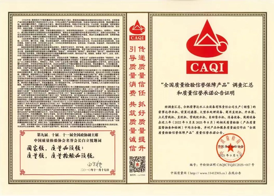 加強(qiáng)質(zhì)量支撐,共建質(zhì)量強(qiáng)國(guó)。在由中國(guó)質(zhì)量檢驗(yàn)協(xié)會(huì)牽頭組織的2025年全國(guó)“質(zhì)量月”企業(yè)質(zhì)量誠(chéng)信倡議專題活動(dòng)中,榮事達(dá)水工業(yè)公司憑借長(zhǎng)期以來(lái)對(duì)產(chǎn)品品質(zhì)的嚴(yán)苛堅(jiān)守與積極正向的社會(huì)形象,成功通過(guò)協(xié)會(huì)多維度審核與專家團(tuán)專業(yè)評(píng)定,最終一舉斬獲“全國(guó)凈水行業(yè)質(zhì)量領(lǐng)先品牌”“全國(guó)質(zhì)量誠(chéng)信先進(jìn)企業(yè)”“全國(guó)質(zhì)量檢驗(yàn)信譽(yù)保障產(chǎn)品”“全國(guó)質(zhì)量檢驗(yàn)穩(wěn)定合格產(chǎn)品”“全國(guó)消費(fèi)者質(zhì)量信譽(yù)保障產(chǎn)品”五項(xiàng)榮譽(yù)。