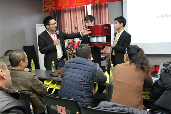 產(chǎn)品是終端營銷的基石,榮事達推出箱體LED純水機,渠道發(fā)展部劉總對產(chǎn)品進行了講解。外觀上,產(chǎn)品以大紅色為主色調,弧形立式設計更精致美觀上檔次。功能上,產(chǎn)品增壓、自吸可一步到位,有效攻克水壓不足、不穩(wěn)問題;配置先進RO反滲透膜,五級過濾系統(tǒng),凈化功能卓越;LED智能顯示,運行狀態(tài)一目了然等。此次會議,公司還推出高端智能凈水機,滿足消費者的不同需求。