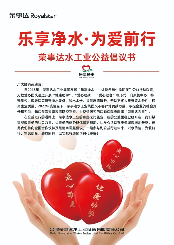- 榮事達(dá)水工業(yè)向全國各地合作伙伴及經(jīng)銷商發(fā)起公益倡議,呼吁大家一起參與到公益行動中來,以水傳情,為愛前行,牢記使命,感恩同行,以實際行動同創(chuàng)時代美好!