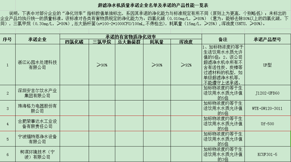 圖為部分超濾凈水機質(zhì)量承諾企業(yè)名單及承諾的產(chǎn)品性能一覽表